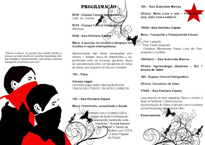 Entre outras atividades previstas para esta edição estão: Bate-papo com integrantes do Movimento Passe Livre, conversa com o pesquisador Alexander Hilsenbeck Filho, exibição do documentário Zapatistas da Big Noise Film, e lançamento do livro "Nem No Centro, Nem Na Periferia" com os últimos comunicados da Selva Lacandona. Confira!